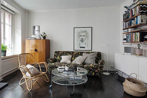 黑色染木地板与白色墙面成为对比,以中性色调为准则搭配丰富多彩的家具。墙上的挂画也是别具一格。