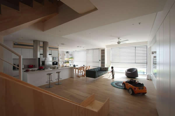 整个客厅看起来非常简单又宽敞,白色墙壁的冷质感,木地板的中和让整个家庭散发出一股温暖自然。简单中又透露出一种时尚感。