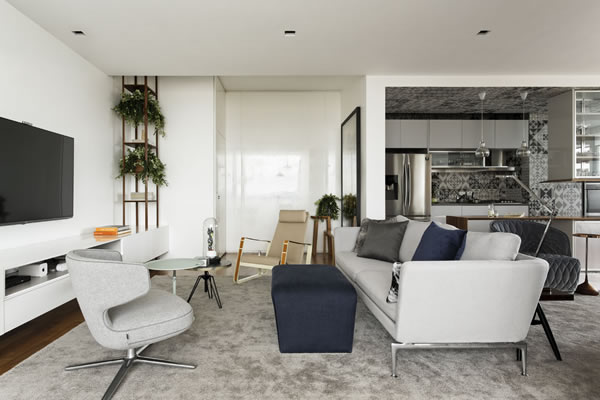 客厅的空间基本用一整块的地毯覆盖,让人有种特别柔然舒服,地毯颜色与厨房的花式墙砖相搭配,这个家居都是绒布材质,整体有种暖和和的感觉。