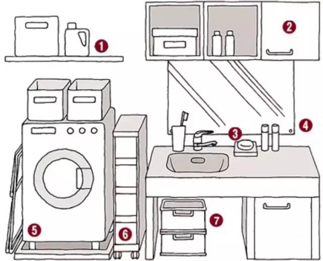 ①洗衣机等大型家具,上方利用层板或层架。